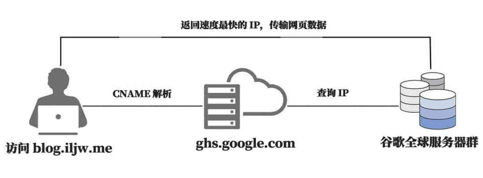 Blogger 之所以需要我们将自定义域 CNAME 解析到ghs.google.com,是为了当我们的读者访问博客时,Blogger 的可以根据读者 IP 地理位置自动跳转至最近的服务器来传输网站的数据(个人猜测)。