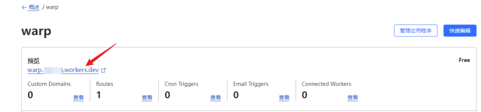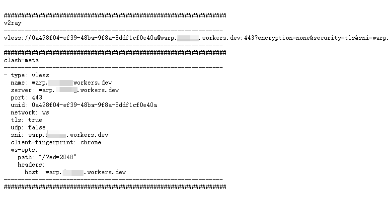 单击创建好的Workers,在出来的链接后面加上userID(http://xxx.com/你自己的userID),会导出warp节点的配置信息,包含了v2ray配置链接和clash-meta的配置信息。