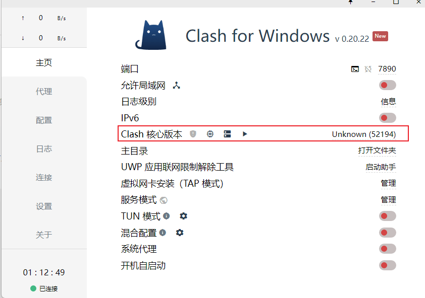 Clash for Windows自身不带meta内核,需要手动下载meta内核替换。下载meta内核文件并解压缩,替换C:\Program Files\Clash for Windows\resources\static\files\win\x64\目录下的clash-win64.exe文件,然后再启动Clash for Windows。如下图所示,表示内核替换成功。