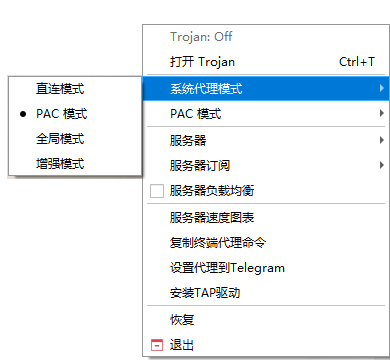 当然,Trojan-Qt5 还支持一些其它代理设置的,包括服务器选择呀、代理方式等,直接点击任务栏图标,按右键就会显示相关内容,具体信息如下:
