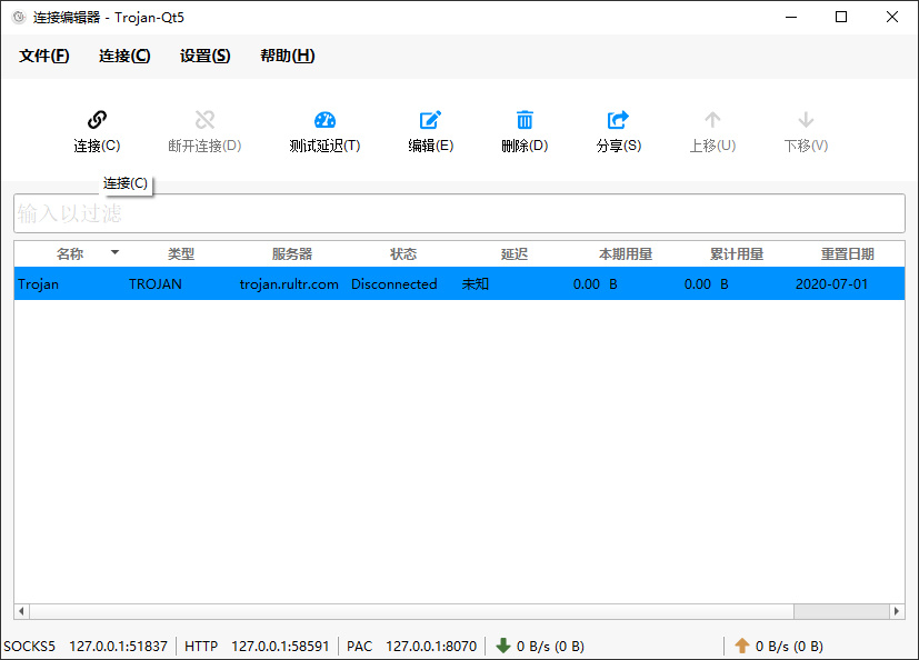 填入 Trojan 服务器的基本信息后,点击”OK”保存配置,注意服务器地址、端口以及密钥信息根据实际情况填写。此时,添加到的 Trojan 服务器就会显示在 Trojan-Qt5 的主界面: