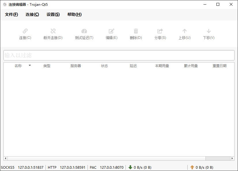 Trojan-Qt5 工具有很多发行格式,其中压缩格式的绿色版软件最为好用,直接运行不需要安装。将压缩文件解压,然后进入解压生成的文件夹,双击”trojan-qt5.exe”运行程序,就会见到如下界面: