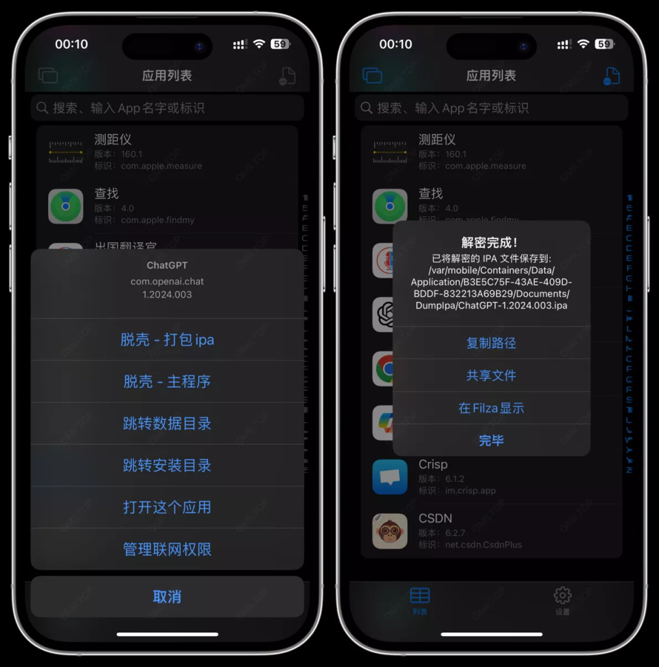 点击需要砸壳的应用若有提示脱壳 证明可砸壳