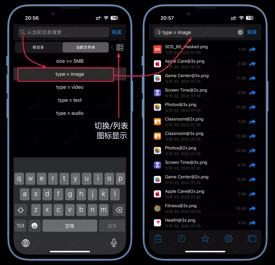 文件管理页面左上角「放大镜」,点选下去就可根据文件大小、类型,直接通过关键字来搜索(分根目录、当前资料夹),且速度极快。