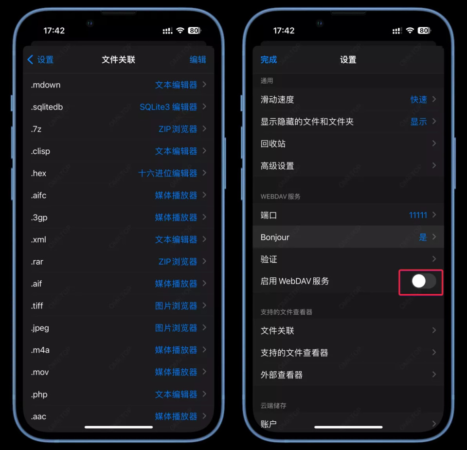 支持启用WebDAV服务开启浏览器访问,便捷了非Mac电脑和苹果手机之间文件传输的问题。