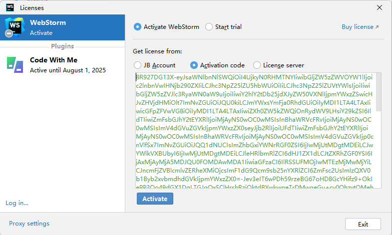 3. 然后打开你要使用JetBrains产品,在激活的地方选择通过激活码方式(Activate code)激活,然后打开网站https://3.jetbra.in任意选择一个可以打开的网站,找到你要激活的软件,复制激活码粘贴到激活码(Activate code)输入框里即可