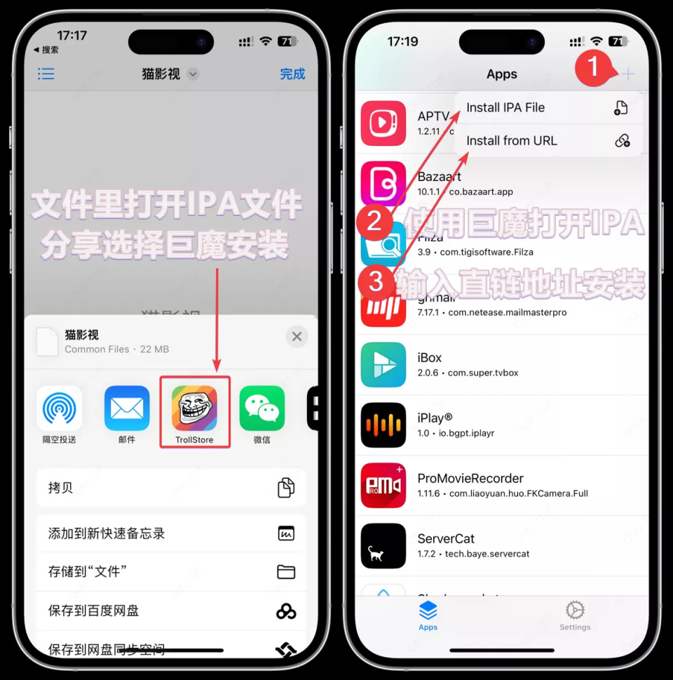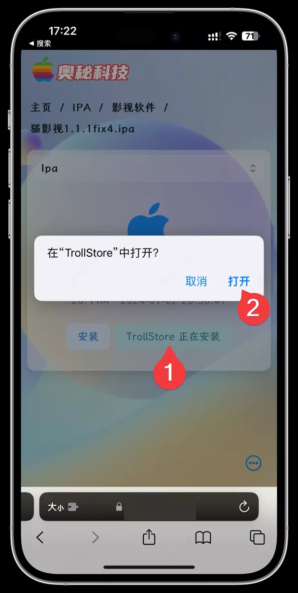 某些支持在线安装的网站,例如alist v3网盘,可以直接点击 TrollStore 或 巨魔 安装。