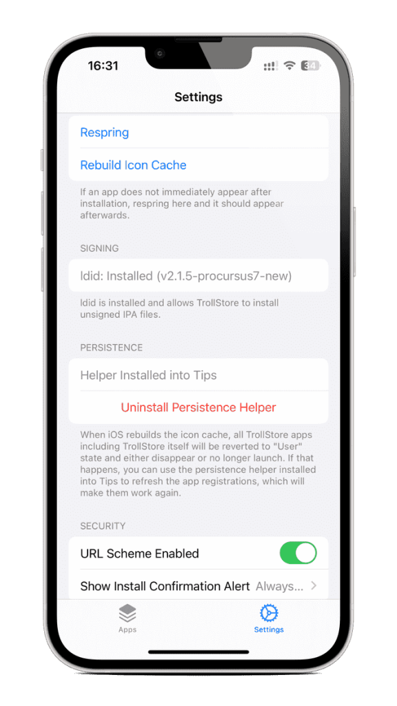 ⑤打开【TrollStore】设置,把ldid点灰,一般会自动加载。点击【Register Persistence Helper】选择Tips,这步是安装巨魔永久性助手,万一巨魔白图标或者打不开,还可以打开提示APP,重新安装巨魔。